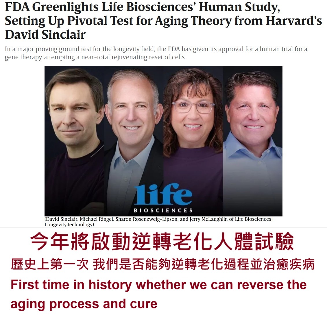 今年將啟動開源程序的逆轉老化人體試驗。
