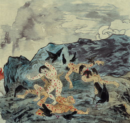 寒山大師詩云:「不行真正道,隨邪號行婆。口慚神佛少,心懷嫉妒多。瞋是心中火,能燒功德林。欲行菩薩道,忍辱護真心。」此獄中鐵鴉密密啄食罪人身,所啄所食皆是罪業所報,而此業正源於心術不正,因忌起恨而害人,為者多是見廣傲才、謀利奪名之人,常導致國綱混亂社會失序。唐時白居易有英氣,對時政屢有革新之諫,為執政者所忌。憲宗元和十年(八一五),藩鎮李師道欲遣人殺害宰相武元衡,白居易上奏請急捕賊,以正官箴,惟遭李德裕等所惡,以「善議大夫不為諫」之莫須有罪名,下貶為江州司馬。白居易此時寫出膾炙人口的〈琵琶行〉,文中藉琵琶女之身世來訴說淒涼,其中尾句「座中泣下誰最多,江州司馬青衫濕」,最是感傷遭忌無以舒懷。晚年潛心於佛道,對世俗名利更是看盡,其〈感興〉兩首詩云:「吉凶禍福有來由,但要深知不要憂。只見火光燒潤屋,不聞風浪覆虛舟。名為公器無多取,利是身災合少求。……我有一言君記取,世間自取苦人多。」唐代後期牛、李黨爭嚴重,給予宦官從中取利之機會,此後七位皇帝都受制於宦官,雖援引朱全忠弭平亂事,卻也斷送了大唐國祚。對於此種權謀亂政害命嫁禍之無奈,難怪白居易喻己為鶴說:「何如斂翅水邊立,飛上雲松栖穩枝。」