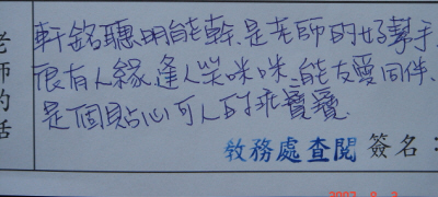 軒銘聰明能幹,是老師的好幫手。很有人緣,逢人笑咪咪,能友愛同伴。是個貼心可人的乖寶寶。