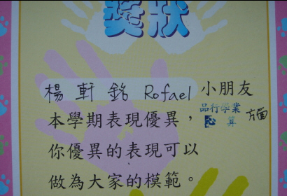 他拿到一張獎狀喔~ 上面寫著 軒銘在 "品行學業" 及 "心算" 方面表現優異。
