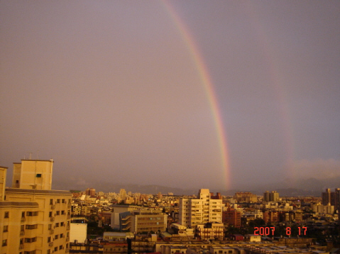 [下圖是] 兩道彩虹,左邊比較明顯的這一道呈現 "內圈紅外圈紫" 的排列,因此是「霓」,右邊那一道則倒過來,就是「虹」了