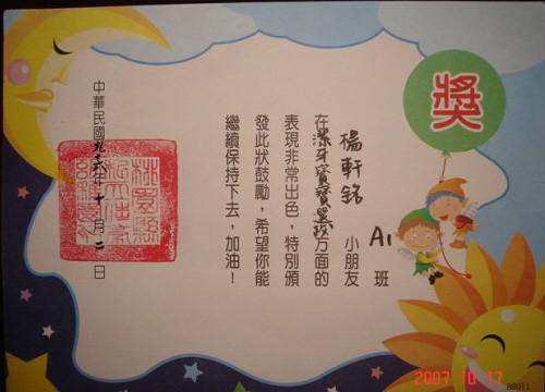 我才驚覺原來每班只選出一位小朋友獲獎,粗心的自己居然如此輕忽小朋友的表現,錯過以事件行銷觀念的黃金時間,趕緊亡羊補牢地把兩個小朋友喚來擁吻一番,再次強調刷牙的重要與必要。