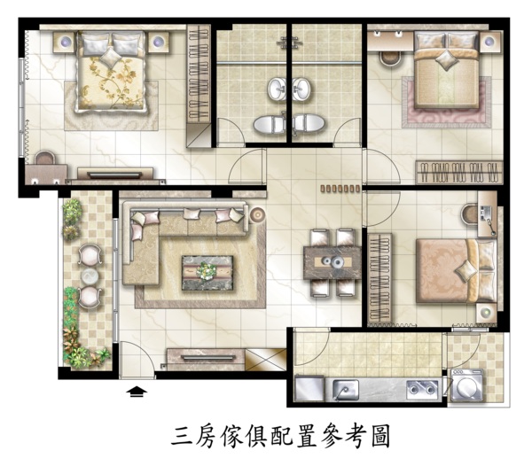 這是一樓 三房的室內配置圖 有沒有感覺很方正很大器呢! 要您自已入住後才知道