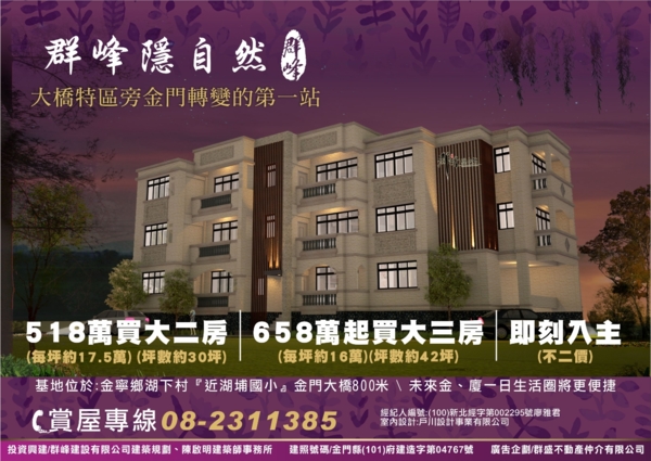 曾經有人問我~~為什麼選擇一個陌生的地方{金門}來蓋房子賣房子 其實我也不知道應該怎麼說~~但金門就是有一種讓我一去想再去的感覺 讓我想在金門創造一個屬於我自已的一個代表作 一個作品 曾經帶了一個金...