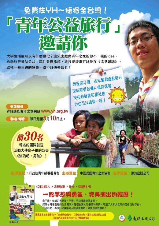以3-5人一隊為單位報名,年齡18-30歲,對公益、訪問有興趣的熱血青年,請踴躍報名! 主辦單位:中華民國國際青年之家協會 合作單位:遠流出版社 如果有疑問請E-mail至 青年之家 ctyha@yh...