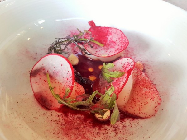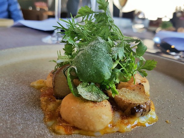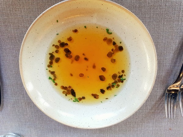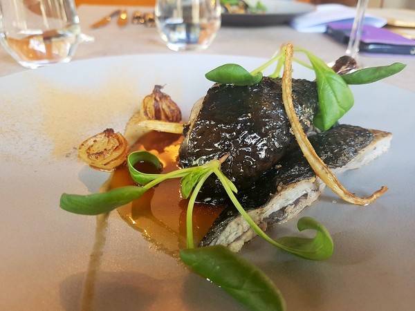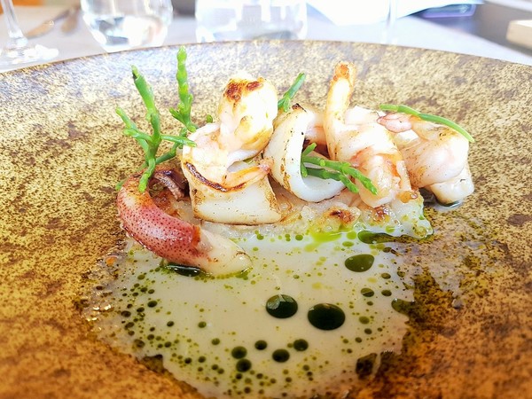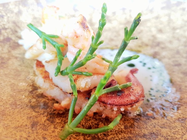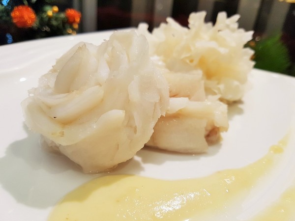 鮮甜美味,搭配白木耳、薏仁及苦瓜,最後佐上主廚精心熬煮的蒜香奶油醬汁
