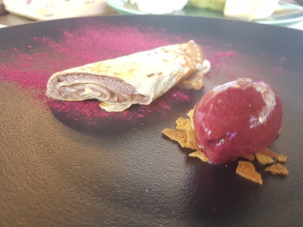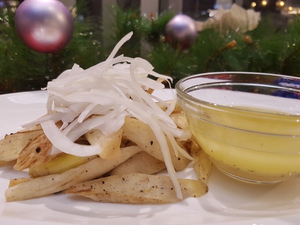 鱈魚玫瑰捲佐蒜味奶油醬(229+10%),另外還特別了製作了炭烤美人腿油醋醬、馬鈴薯