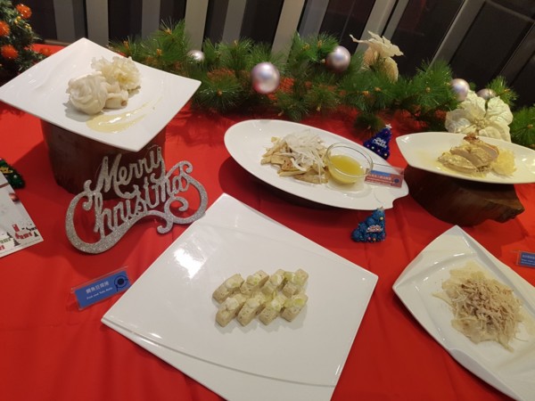 白香腸沙拉、鯛魚豆腐捲、南洋耶香雞肉蒟蒻麵置於自助餐檯上,一整個白色視覺,感覺
