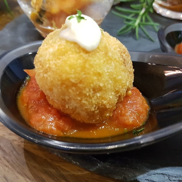 捏製成球狀,裹上麵粉、蛋液、麵包粉後過炸至表面金黃。品嚐時,表面酥帶脆,