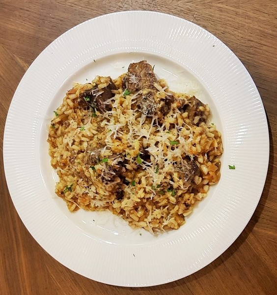著倒入紅酒燉煮至熟軟入味;續取其醬汁及雞高湯,再加上義大利米燉煮至