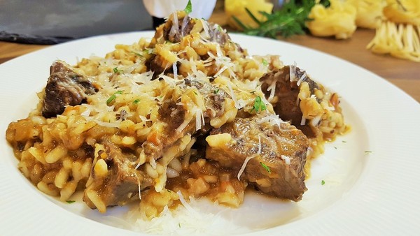 吸汁軟化,最後再與牛肉及蔬菜結合。熟軟、略帶彈牙的燉飯,嚐得到義式