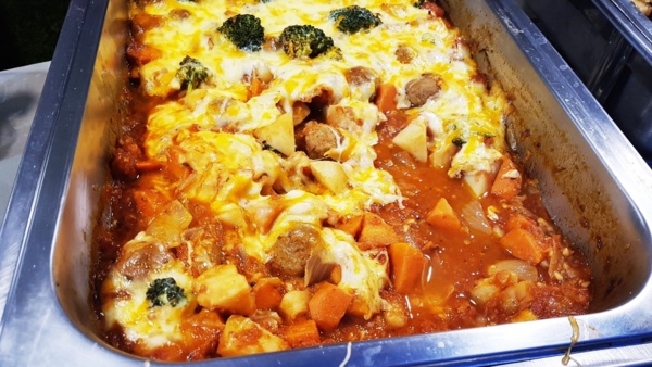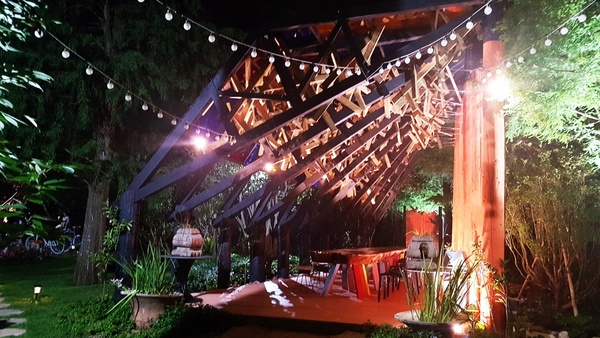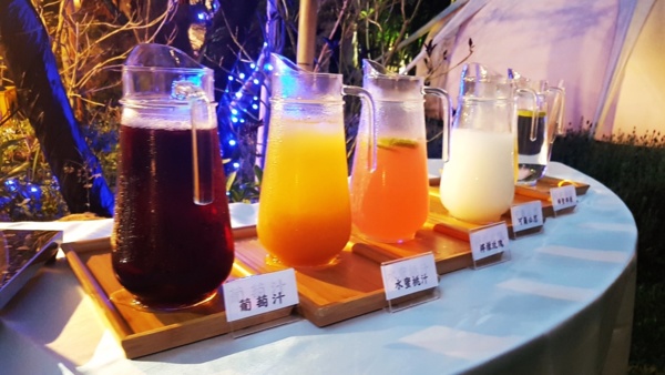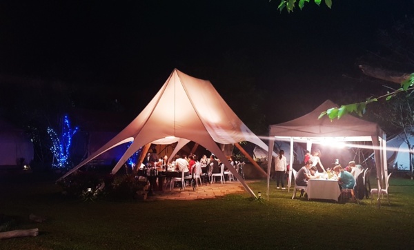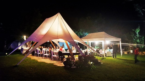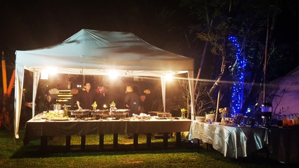 營火,白色大棚架、草地上的餐桌、無限取用的自助餐檯~~~