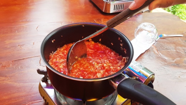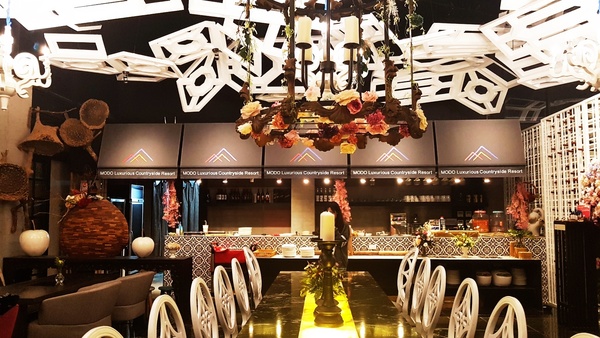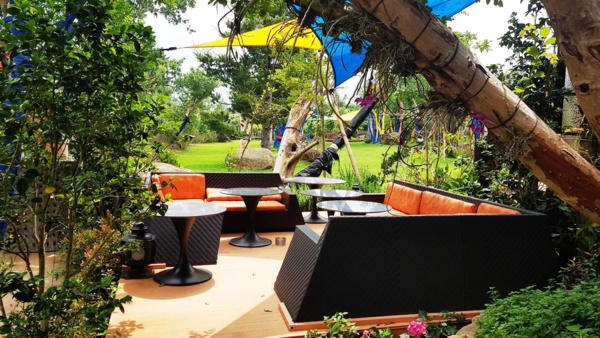 中間的綠地是大地餐桌,廚師的料理台直接呈現客人眼前,晚宴時,涼風徐徐,一抬頭