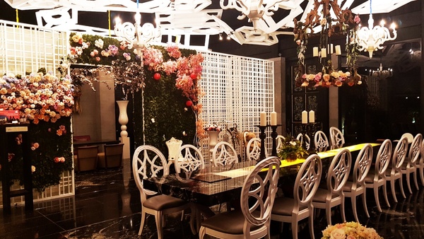 燈一暗,投影機一投射,餐桌上方的白色棚布,立刻變成了螢幕,