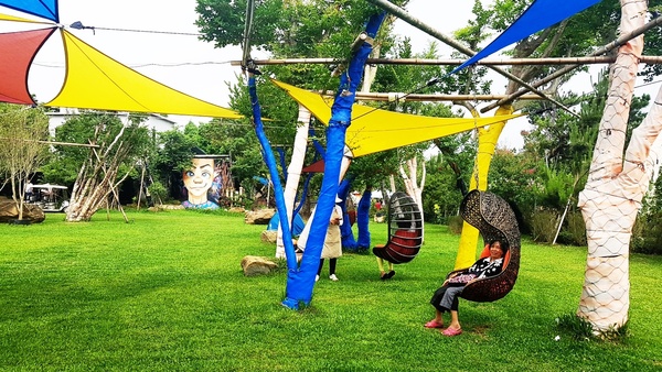 園區內有不少亭子,設置了舒適的沙發座椅,遊客可在此泡茶閒聊,