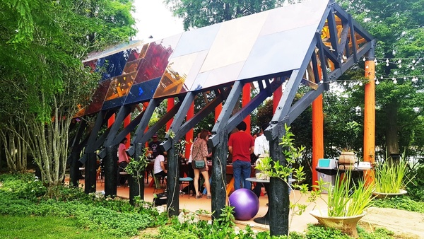 彩虹屋是一處手作課程體驗區,斜頂式的半開放涼亭,屋頂是採預三原色的玻璃