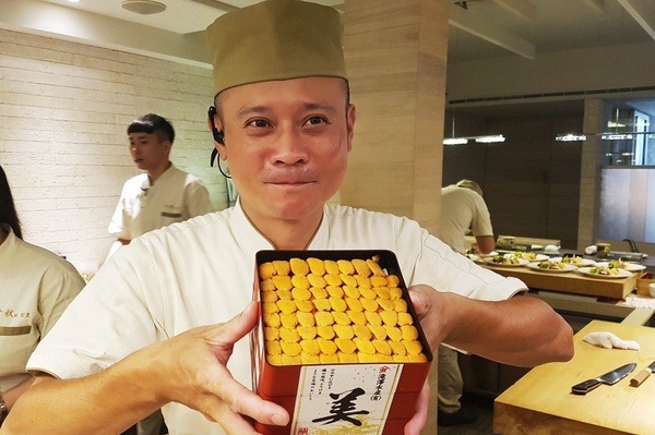 看看他手中拿的海膽,是凌晨請人在築地市場標得,立刻空運來台的頂級馬糞海膽