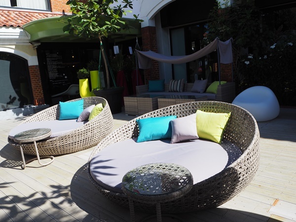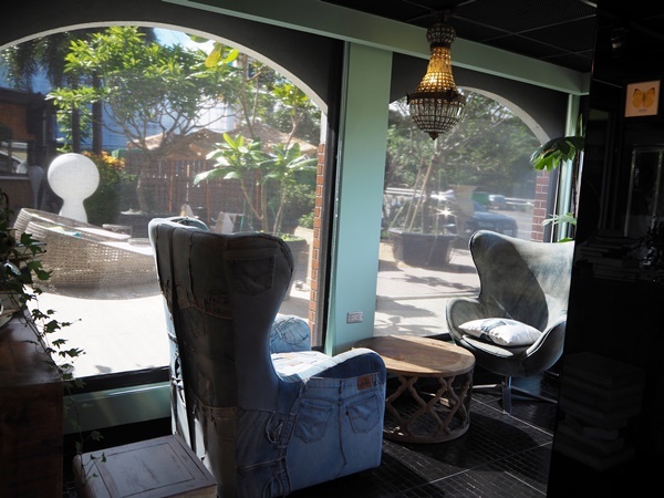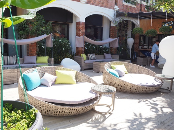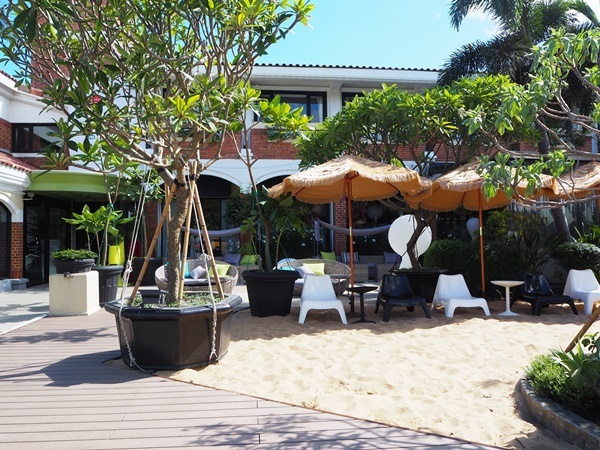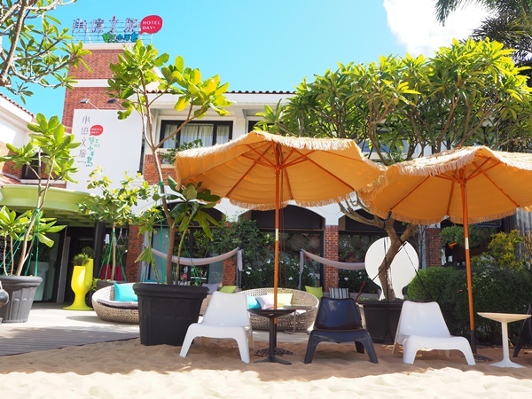 不用去海邊,大門口布置了沙灘和休閒椅、遮陽傘,躺在院子裡就很有FU