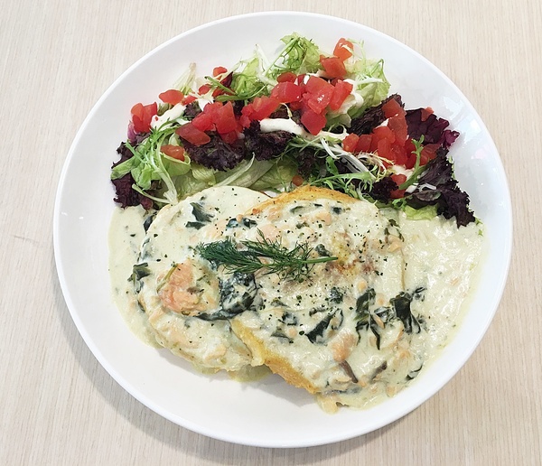 奶油起司醬搭配鮭魚及法國吐司吃法,建議要求店家不要將醬汁淋上去,另外盛裝