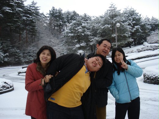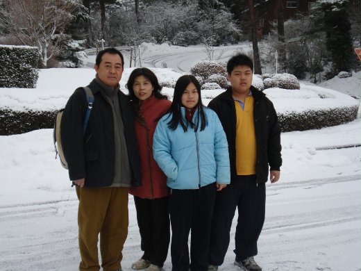 果真在山陰地區白雪靄靄,〈有照片為証,這是在鳥取大山溫泉飯店前所拍〉一到山陽地區則陽光普照,不見雪花紛飛。