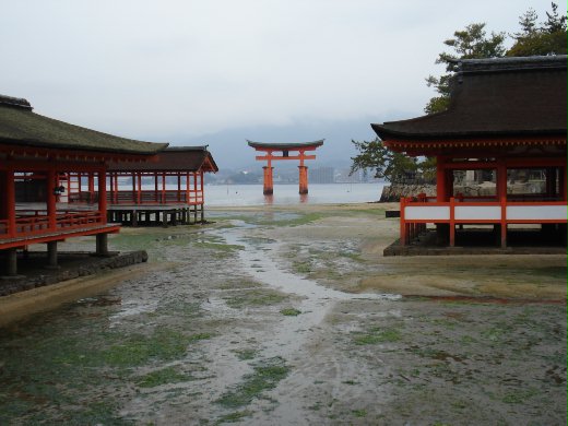 放上在嚴島神社〈又稱宮島神社〉所拍的照片回味:一張是搭渡輪至宮島,參觀世界遺產--嚴島神社,古樸的絲柏皮屋頂,朱紅色的棟樑,紅色的大鳥居佇於海上,風光明媚。