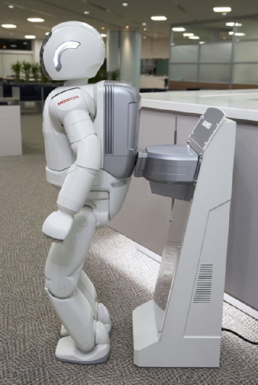 有一名ASIMO偵測到電力不足時,便會自行到專用充電座補充能源,