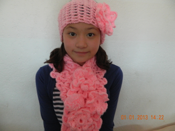 寒假裡,除了過聖誕節,迎新年我們沒有安排任何行程,這裡天天冷到華氏零度...再有興致也懶得把自己包得像粽子一樣的出門,更不想讓他們整天對著X- BOX對著空氣揮舞,或是只做"大拇指"運動...於是我跟JENNY提議說想不想學打毛線? ...她小妮子眼睛一亮連說好...我這個老粗從來不是作細活的料...因為我沒有耐心...我警告她說,材料都不便宜而且這手藝超級需要"耐心"學習的....她很自信的說。..我可以的!....這女兒全身身上下找不出一點像我的地方,就這"急性子"像極了我...我竟然傻傻地相信她 ....唉!...當了媽在孩子面前總是聰明不起來...就這樣..過了第二天只剩下我獨自奮鬥....不玩還好,一碰就上癮我這呆呆的初學者玩出興趣來...簡單的針法玩出一套圍巾跟髮帶....女兒"堅決"挑出的粉紅色讓我很有意見...可是當她一穿戴上之後又一副無敵的青春妹妹樣...啊!....