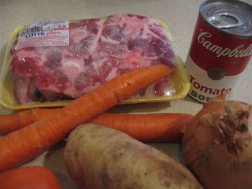 材料:美國牛尾一包(Ox Tail 約兩磅)、洋蔥一顆、番茄小兩顆大一顆、薑片兩片、番茄湯罐頭一罐、馬鈴薯兩顆、紅蘿蔔一根、包心菜(隨意,也可不加)、黑胡椒和鹽少許.