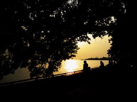 堤防邊,夕陽耀眼,躲進榕樹下看書,奢侈的金黃色陽光,從葉縫中