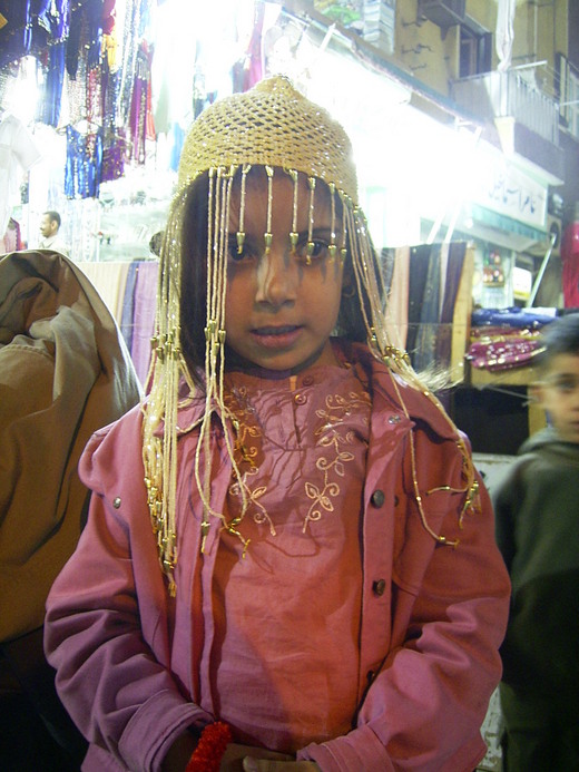 很大的埃及小妹妹,一直巴著媽媽讓她買一個埃及豔后式的金黃頭套