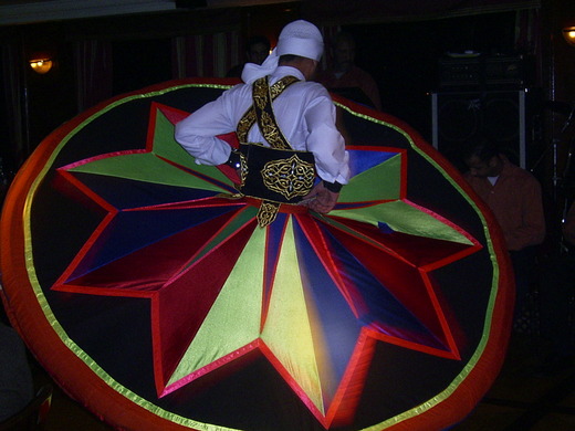 接著是蘇非舞表演,只見一個戴白色頭巾、穿白色罩衫的中東男子,