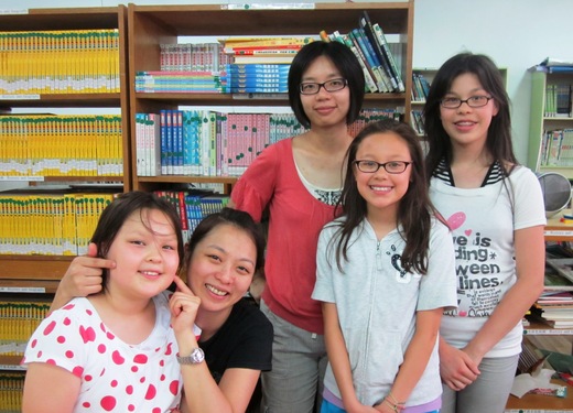 媽媽輔導學童作功課,三個女兒教當地學童簡單英文及摺紙,雖然住