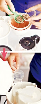 將一大匙檸檬草放入咖啡機,再加入100c.c.的純水煮沸。(下圖1)