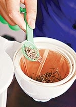 將一大匙薄荷和一小匙迷迭香加入咖啡機,再加入100c.c.的純水蒸餾煮沸後,放置一旁待涼約20℃。(上圖)