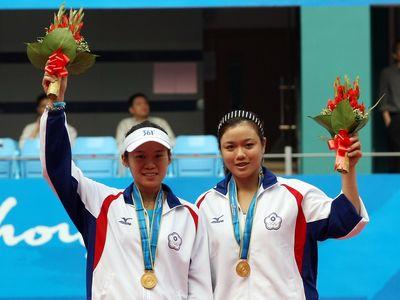 (中央社亞運採訪團廣州22日電)廣州亞運網球女雙決賽,中華隊姊妹鬩牆,第1種子詹詠然與莊佳容以直落二擊敗第3種子張凱貞、謝淑薇,摘下金牌,這也是中華代表團在廣州亞運的第7面金牌。