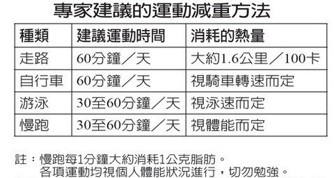 平均減掉1磅(約0.45公斤)脂肪,要消耗350卡的熱量,大家可以選擇適合自己體能的運動。如果沒有維持正常的運動習慣,體重容易快速上升。