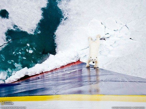 地球愈來愈熱,北極熊快因沒有地方住而瀕臨絕種,日前「國家地理頻道」的探險團隊,在挪威斯瓦爾巴德(Svalbard, Norway)拍到一張值得令人深思的照片;一隻母北極熊雙腳踏在瀕臨碎裂、崩解的冰床上,伸手扶住破冰船,不少網友有感而發,將此動作解釋為「阻擋船隻、保衛家園」。