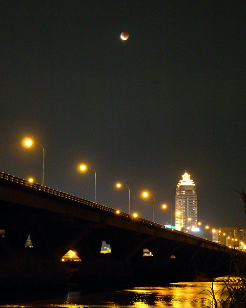 紅月亮 要在1920前才有機會拍到 所以我才會天沒黑就在橋上來回走,本想拍月昇,等了快1個小時才在半空中找到紅月亮。