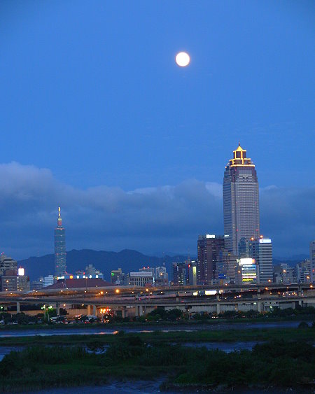 傍晚6點下班後,就跑到忠孝橋上等月出,無奈東邊有雲霾,兩眼直瞪天空,心中懷疑是不是被建築物擋住了,直到快七點,突然見到紅影子,這才放心。