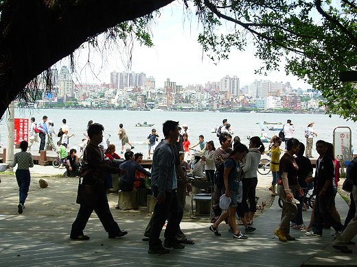 在這暖暖春日,搭著順風車上觀音山瞧瞧,到關渡站遇到中午接駁車休息,變更計畫先到八里渡船頭以小吃果腹,還可讓小朋友玩一下遊樂器材,週六Lanew辦八里左岸健走活動,人群雜沓,好不熱鬧,中午艷陽下,老榕碉堡便成眾人的乘涼聖地。