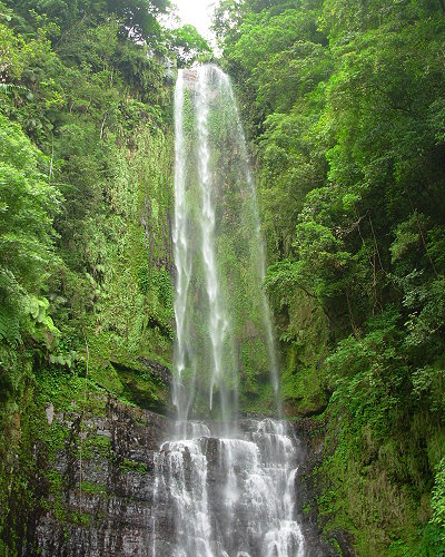 從第二層再走上20分鐘,便可登上步道頂,即是最高層的第一層瀑布區,隱身山岩森林間,人未到,水氣撲面而到,隨著日照,常出現彩虹,隨著光影變化而變化,有種莫測的美感。可惜這天沒遇上彩虹。