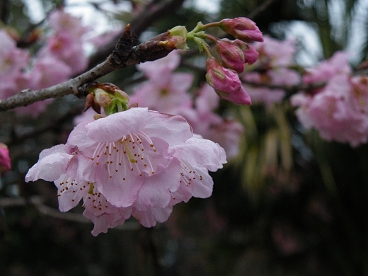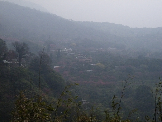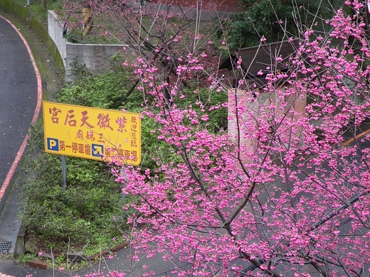 三峽老街旁山坡的山櫻還沒動靜;白雞山行修宮山櫻花開,但無法成大景;紫微天后宮廟前樓梯旁及路口的八重櫻正盛開;建安131櫻園位於獅頭山半山腰,雖一路有指標,聯外道路及庭園卻無法容納太多賞櫻遊客,還好今天雨後陰冷,躲過人塞會車之苦。新店台北華城山頭的社區道路旁,懶散的山櫻花間,遇到兩棵頗大的椿寒櫻正盛開,又發現到目標櫻種。