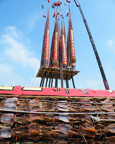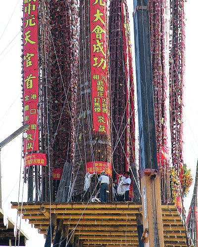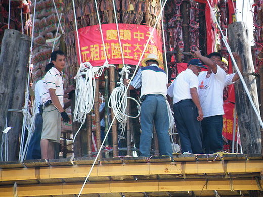 周六購買東北角一日券搭乘火車一日遊,午後巧遇頭城搶孤活動豎孤棧,這是夜間搶孤活動的前置作業,難得的機會,二話不說,全家從火車站搭計程車前往烏石漁港一探搭孤棧的過程,也剛好遇上豎立最後一支孤棧。