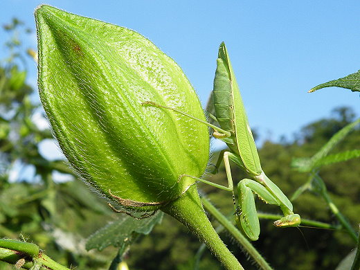 又看到綠色的螳螂了,不知是不是去年那隻;接下來是躲在青苧麻葉下一大群小花;然後是黃葵葉下的台灣大蝗,那雙強有力的後腿,在脛節上附上紅色刺,是很好的防衛武器,一般人很難輕易抓住。