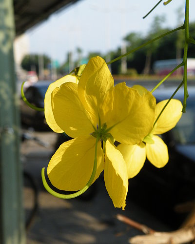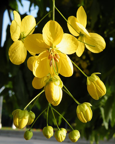 夏季開金黃色花,總狀花序腋生,成串下垂甚為醒目,花瓣5枚離生,大小略等,雄蕊10枚,花絲黃色彎成勾狀,其中有三枚特長、四枚中等而另三枚較短為不孕性。