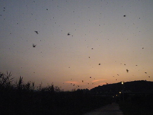 本以為洲仔重劃區開發與台64線快速道路通車會影響到五股溼地的夏日群燕亂舞,結果是我多慮了,南遷過境的燕群,準時的在八月底報到,趕緊前往紀錄這場盛會。這幾天天候頗佳,黃昏有夕陽美景可看,太陽下山後還有好戲續攤,就在那天將暗之際,大批燕群突然就出現在五股溼地的上空,進行群燕亂舞晚點名,低空分列式閱鳥,讓眾人抬頭驚呼,直到夜幕低垂。