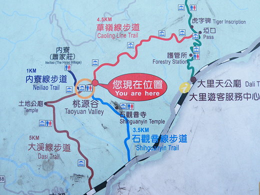 其實在蕭家莊那裡有較大停車場,然後從公厠旁的步道上去,走約卅分鐘即可達桃源谷的項端,那裡看風景更漂亮!再從山頂走到桃源谷涼亭不過是幾分鐘的事。步道都舖有石板,非常好走,下回試試看!會比直接開車上去有趣,沿途還可拍照。