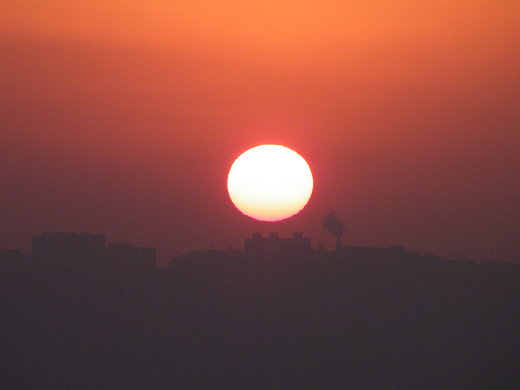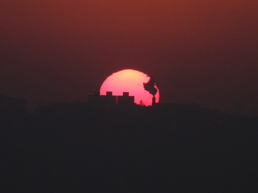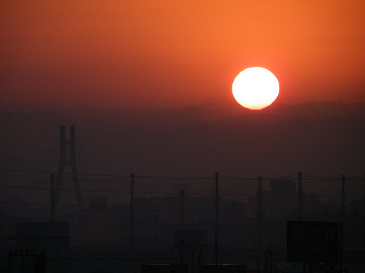 這天的台北日出日落全拜霾害所賜,才得以見到紅鴨蛋般的太陽。我所眼見的日出方位恰巧有全國加油站的降價促銷廣告,傍晚的日落方位,正好是台塑集團