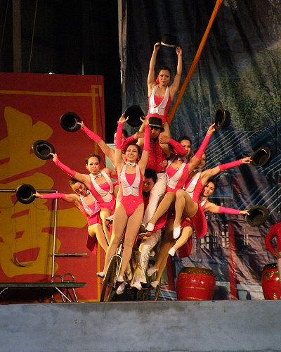初三下午的節目,兩個小時的節目全是特技表演,耍旗、搖呼拉圈、女子雙人盪繩、爬竿、火舞、特技單梯、轉布、男女雙人盪繩、頂缸、獨輪車、特技單車疊羅漢,中間夾雜小丑表演,吸引許多到竹林山觀音寺參拜的信眾抽空觀賞。