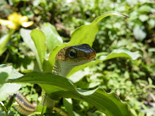 the composition is artful too. the snake sticks out its head with a leave overhangs its head pointing to the same direction as the leaf.